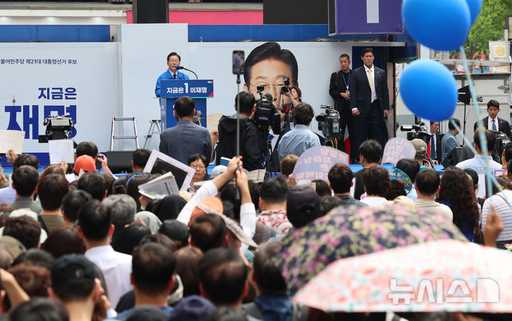 [대구=뉴시스] 권창회 기자 = 이재명 더불어민주당 대선 후보가 13일 대구 중구 동성로 광장에서 열린 집중유세에서 지지호소를 하고 있다. 2025.05.13. [email protected]