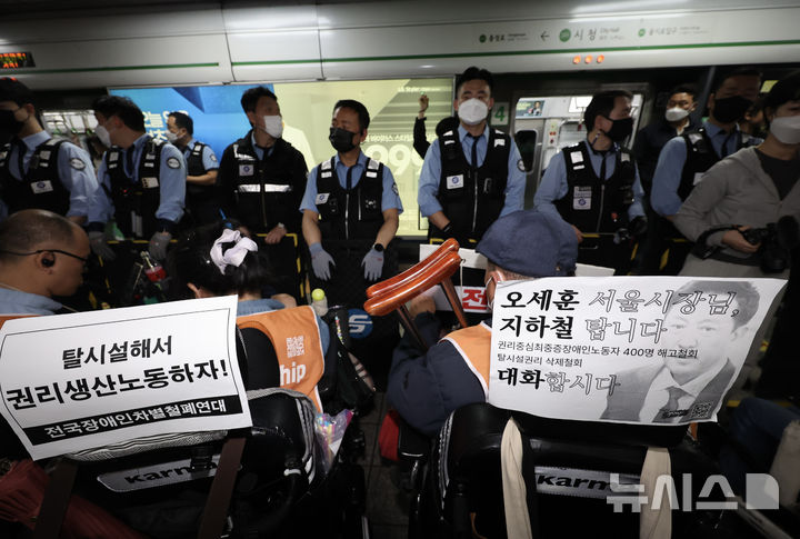 [서울=뉴시스] 김명년 기자 = 전국장애인차별천폐연대 회원들이 13일 오후 서울 종로구 시청역 2호선 승강장에서 집회를 열고 오세훈 서울시장에게 대화를 촉구하고 있다. 2025.05.13. [email protected]