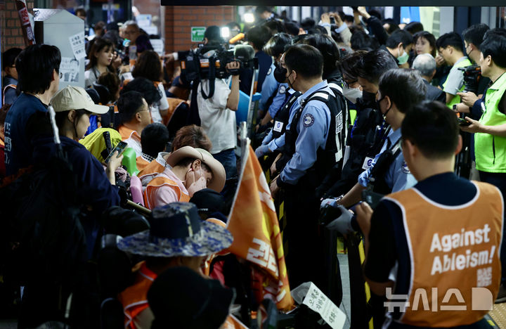 [서울=뉴시스] 김명년 기자 = 전국장애인차별천폐연대 회원들이 13일 오후 서울 종로구 시청역 2호선 승강장에서 집회를 열고 오세훈 서울시장에게 대화를 촉구하고 있다. 2025.05.13. [email protected]