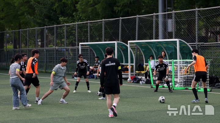 [서울=뉴시스] 홍효식 기자 = 13일 오후 서울 동작구 보라매공원 축구장에서 뉴시스(대표이사 사장 염영남) 임직원, 한국프로축구연맹 임직원, 서울시립발달장애인복지관 발달장애 선수들이 통합축구 경기를 하고 있다.