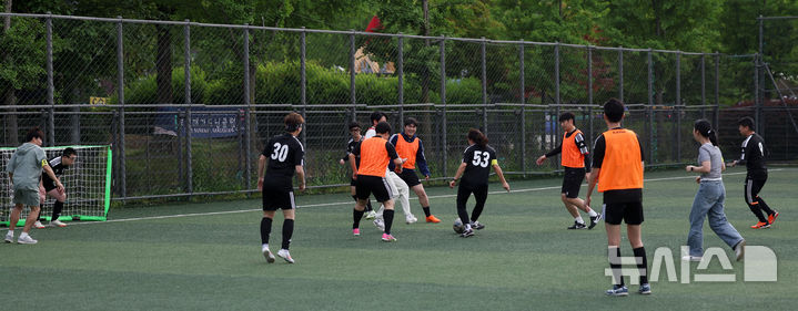 [서울=뉴시스] 홍효식 기자 = 13일 오후 서울 동작구 보라매공원 축구장에서 뉴시스(대표이사 사장 염영남) 임직원, 한국프로축구연맹 임직원, 서울시립발달장애인복지관 발달장애 선수들이 통합축구 경기를 하고 있다.