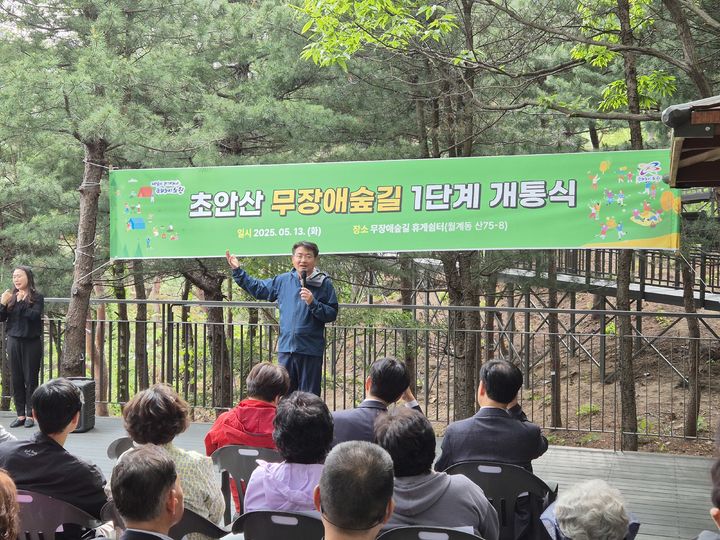 [서울=뉴시스] 조수정 기자 = 오승록 노원구청장이 13일 오후 서울 노원구 초안산 무장애숲길 1단계 구간 개통식에서 인사말 하고 있다.