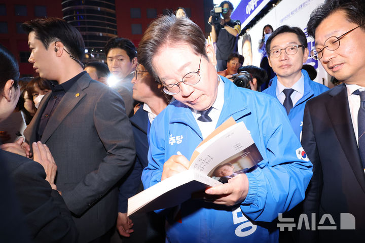 [울산=뉴시스] 권창회 기자 = 이재명 더불어민주당 대선 후보가 13일 울산 남구 롯데백화점 울산점 광장에서 열린 유세를 마치고 지지자들이 건넨 책에 사인을 해주고 있다. 2025.05.13. [email protected]