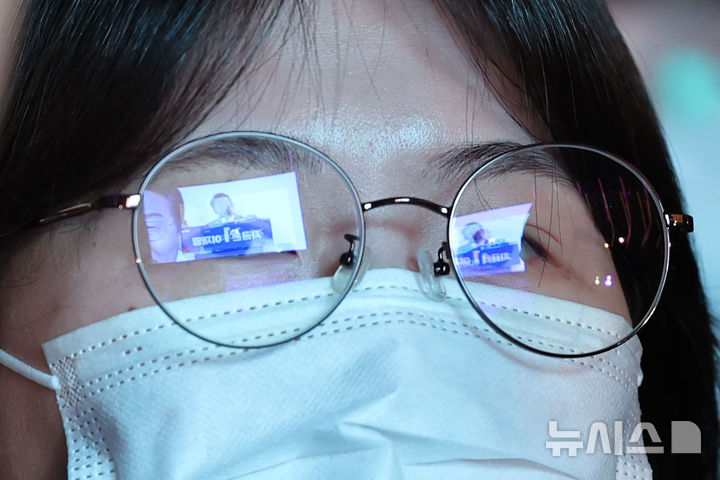 [울산=뉴시스] 권창회 기자 = 이재명 더불어민주당 대선 후보가 13일 울산 남구 롯데백화점 울산점 광장에서 열린 유세에서 지지호소를 하고 있는 가운데 한 지지자의 안경에 이재명 후보의 모습이 비치고 있다. 2025.05.13. [email protected]