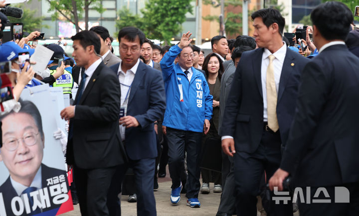 [울산=뉴시스] 권창회 기자 = 이재명 더불어민주당 대선 후보가 13일 울산 남구 롯데백화점 울산점 광장에서 열린 유세에 참석하며 인사를 하고 있다. 2025.05.13. [email protected]