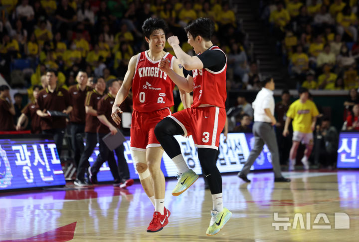 [서울=뉴시스] 김선웅 기자 = 13일 서울 송파구 잠실학생체육관에서 열린 2024-2025 프로농구 챔피언결정전 서울 SK 나이츠 vs 창원 LG 세이커스 5차전 경기, SK 김태훈과 최원혁이 점수에서 앞서가는 가운데 작전타임을 갖기 위해 이동하며 기뻐하고 있다. 2025.05.13. [email protected]
