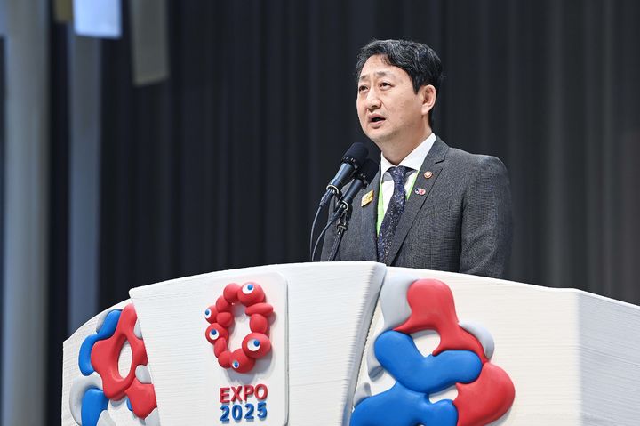 [서울=뉴시스] 조수정 기자 = 안덕근 산업통상자원부 장관이 13일(현지 시간) 일본 오사카 엑스포장에서 열린 '2025 오사카엑스포 한국의 날 기념식'에 참석해 인사말을 하고 있다. (사진=산업통상자원부 제공) 2025.05.13. [email protected] *재판매 및 DB 금지