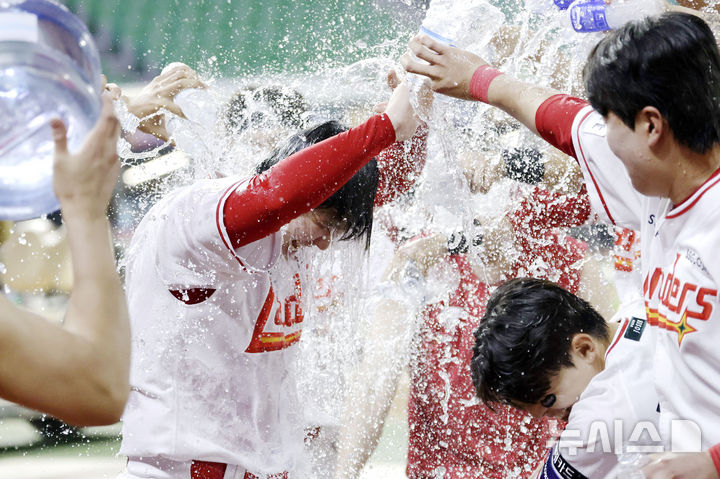 [인천=뉴시스] 최동준 기자 = SSG 최정이 NC와의 경기에서 KBO리그 첫 통산 500홈런을 기록한 13일 인천SSG 랜더스필드에서 동료들에게 축하 물세례를 받고 있다. 2025.05.13. [email protected]