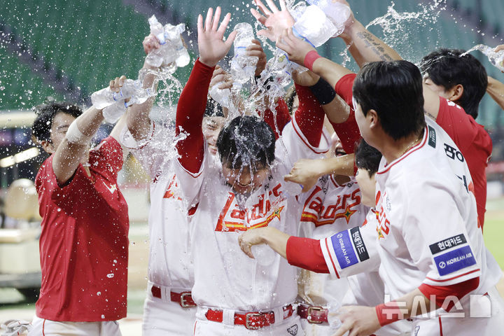 [인천=뉴시스] 최동준 기자 = SSG 최정이 NC와의 경기에서 KBO리그 첫 통산 500홈런을 기록한 13일 인천SSG 랜더스필드에서 동료들에게 축하 물세례를 받고 있다. 2025.05.13. [email protected]