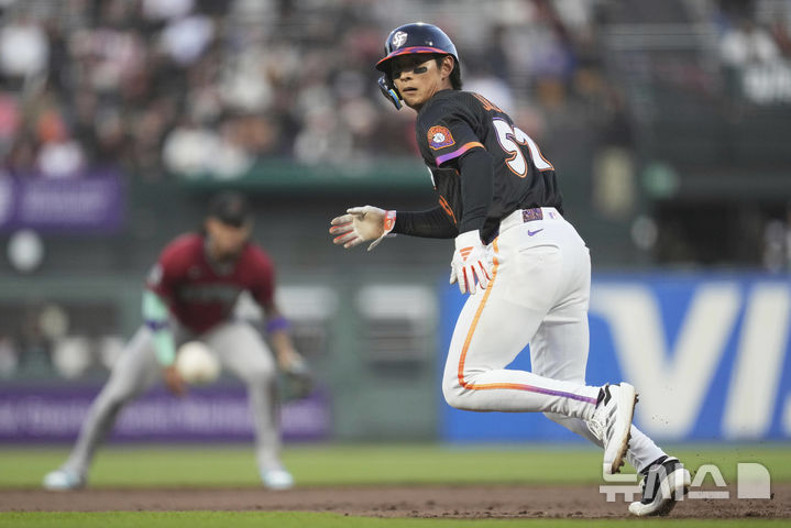 [샌프란시스코=AP/뉴시스] 샌프란시스코 자이언츠의 이정후가 13일(현지 시간) 캘리포니아주 샌프란시스코 오라클 파크에서 열린 2025 메이저리그 애리조나 다이아몬드백스와의 경기 3회 말, 중전 안타로 출루한 뒤 라몬트 웨이드 주니어의 안타 때 3루까지 달리고 있다. 2025.05.14.