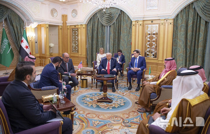 [리야드(사우디아라비아)=AP/뉴시스]도널드 트럼프 미 대통령(가운데)과 마코 루비오 국무장관(오른쪽 3번째)이 14일 리야드에서 아흐마드 알-샤라 시리아 임시 대통령(왼쪽 2번째) 및 모하메드 빈 살만 사우디 왕세자(오른쪽 2번째)를 만나고 있다.
