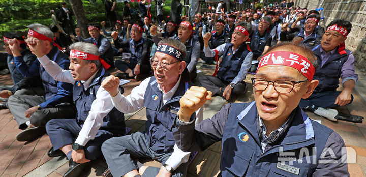 [서울=뉴시스] 김금보 기자 = 전국자동차노동조합연맹 서울시버스노동조합 조합원들이 14일 서울 중구 서울시청 서소문별관 앞에서 '단체교섭 승리, 서울시 규탄 결의대회'를 열고 구호를 외치고 있다. 2025.05.14. [email protected]