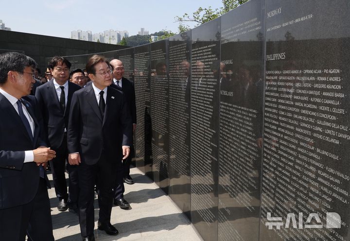 [부산=뉴시스] 권창회 기자 = 이재명 더불어민주당 대선 후보가 14일 부산 남구 유엔기념공원을 찾아 전몰자 위령탑을 둘러보고 있다. (공동취재) 2025.05.14. [email protected]