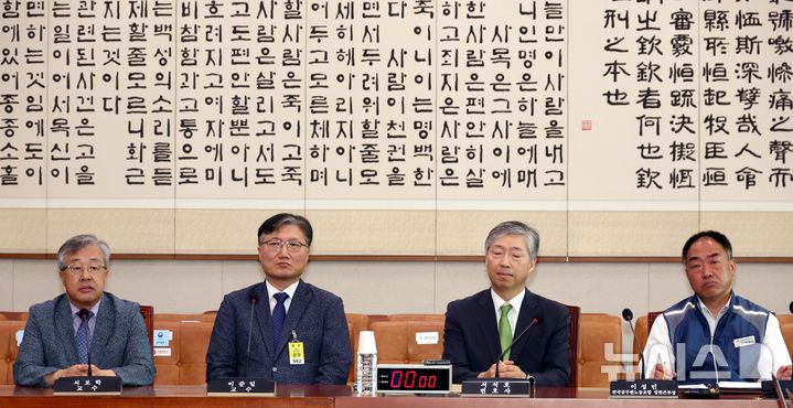[서울=뉴시스] 조성봉 기자 = 서보학 경희대학교 법학전문대학원 교수가 14일 오전 서울 여의도 국회 법제사법위원회에서 열린 조희대 대법원장 등 사법부의 대선개입 의혹 진상규명 청문회에서 의원의 질의에 답변하고 있다. 왼쪽부터 서 교수, 이준일 고려대학교 법학전문대학원 교수, 서석호 변호사, 이성민 전국공무원노조 법원본부장. 2025.05.14. [email protected]