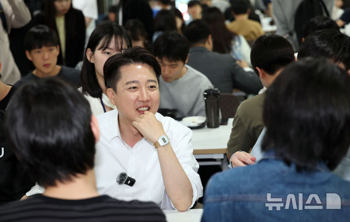 [부산=뉴시스] 하경민 기자 = 이준석 개혁신당 대통령 선거 후보가 14일 부산 금정구 부산대학교 학색식당에서 학식을 먹으며 학생들과 대화하고 있다. 2025.05.14. [email protected]
