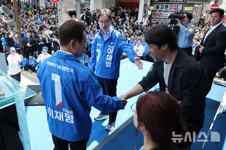 [부산=뉴시스] 권창회 기자 = 이재명 더불어민주당 대선 후보가 14일부산 부산진구 서면 젊음의 거리에서 열린 유세에서 황현필 한국사 강사와 악수하고 있다. (공동취재) 2025.05.14. [email protected]