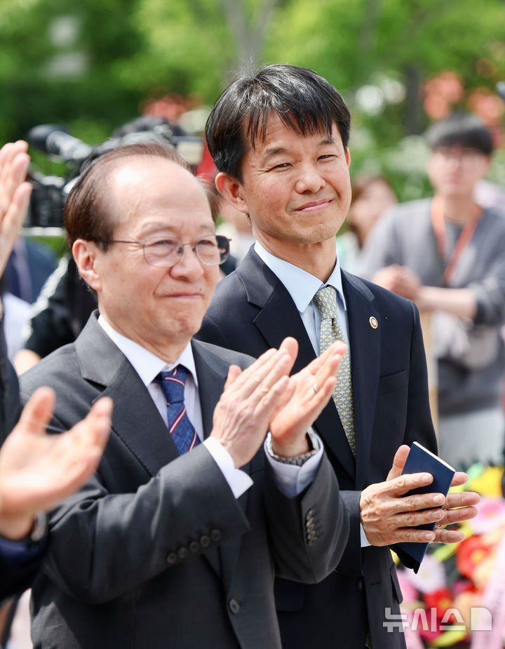 [서울=뉴시스] 김명년 기자 = 용호성 문화체육관광부 제1차관이 14일 오후 서울 종로구 광화문광장 세종대왕 동상에서 열린 '세종대왕 나신 날 시민참여 경하 헌화식'에서 박수치고 있다. 2025.05.14. [email protected]