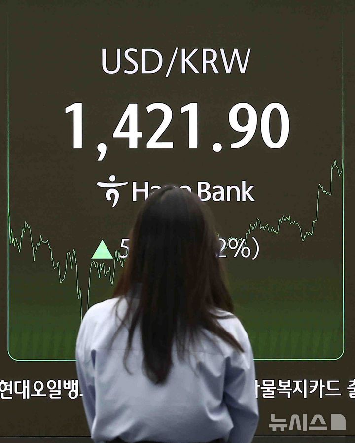 [서울=뉴시스] 김근수 기자 = 외환시장에서 원·달러 환율은 전 거래일(1416.0원)보다 4.2원 오른 1420.2원에 주간 거래를 마감한 14일 서울 중구 하나은행 본점에서 모니터에 지수가 나오고 있다.