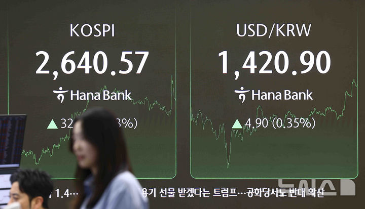 [서울=뉴시스] 김근수 기자 = 코스피가 전 거래일(2608.42)보다 32.15포인트(1.23%) 오른 2640.57에 마감한 14일 서울 중구 하나은행 본점에서 모니터에 지수가 나오고 있다.