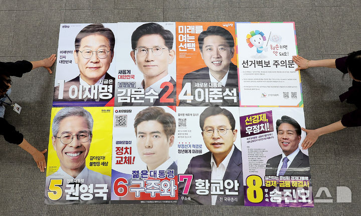[대구=뉴시스] 이무열 기자 = 21대 대통령선거를 20일 앞둔 14일 대구 서구 대구광역시선거관리위원회에서 관계자들이 접수된 후보들의 선거벽보를 살펴보고 있다. 2025.05.14. [email protected]