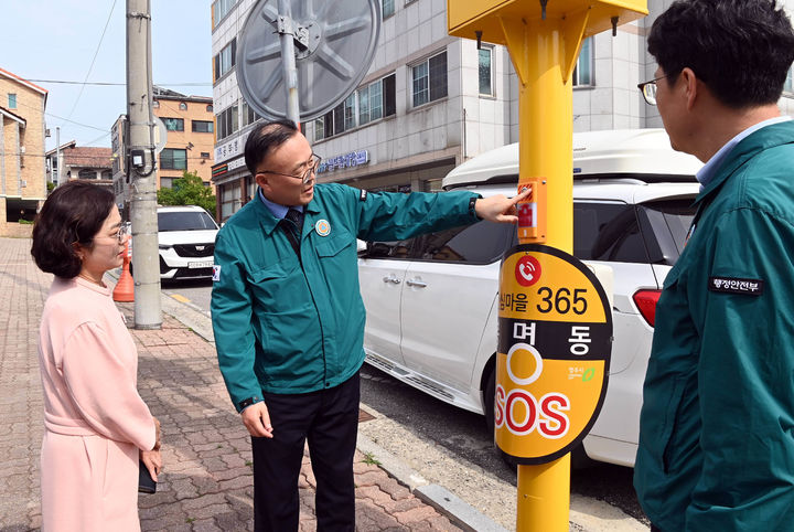 [서울=뉴시스] 이한경 행정안전부 재난안전관리본부장이 14일 충북 충주시 봉덕초등학교 앞 어린이보호구역을 방문해 교통안전 시설을 점검하고 있다. (사진=행정안전부 제공) 2025.05.14. [email protected] *재판매 및 DB 금지
