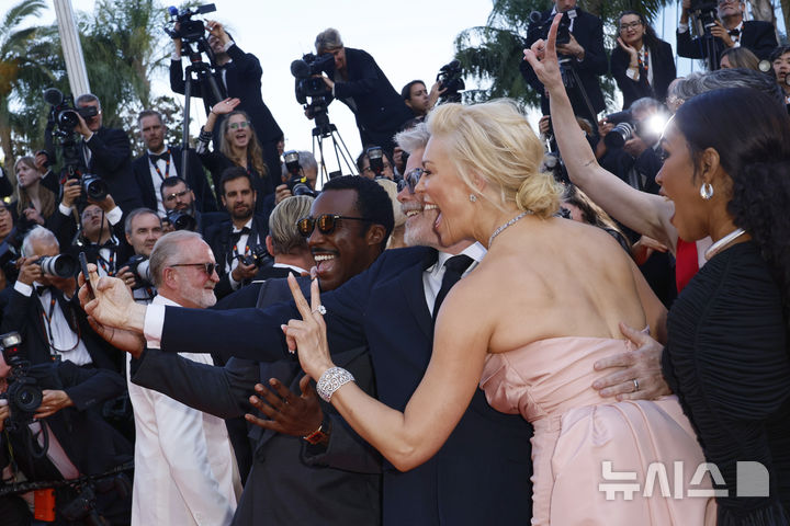 [칸=AP/뉴시스] 크리스토퍼 맥쿼린 감독과 한나 웨딩햄 등이 14일(현지 시간) 프랑스 남부 칸에서 열린 제78회 칸국제영화제 ‘미션 임파서블: 파이널 레코닝’ 시사회에 참석해 셀카를 찍고 있다. 2025.05.15.