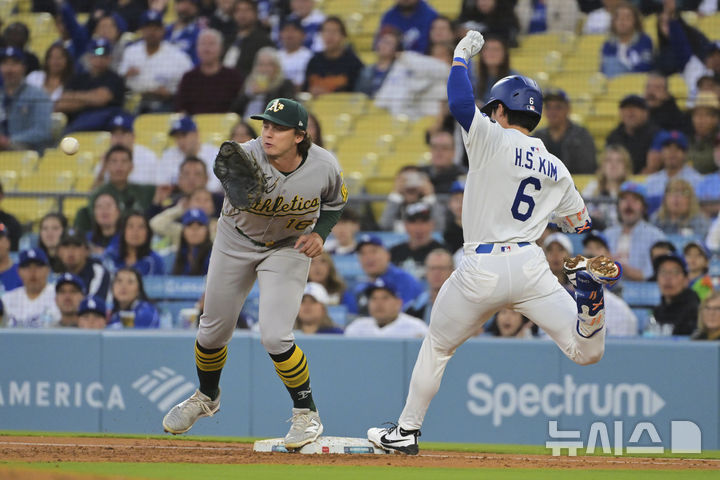[로스앤젤레스=AP/뉴시스] LA 다저스의 김혜성(오른쪽)이 14일(현지 시간) 미 캘리포니아주 로스앤젤레스의 다저스타디움에서 열린 2025 메이저리그 오클랜드 애슬레틱스와의 경기 2회 말 내야 안타로 1루에 진루하고 있다. 2025.05.15.