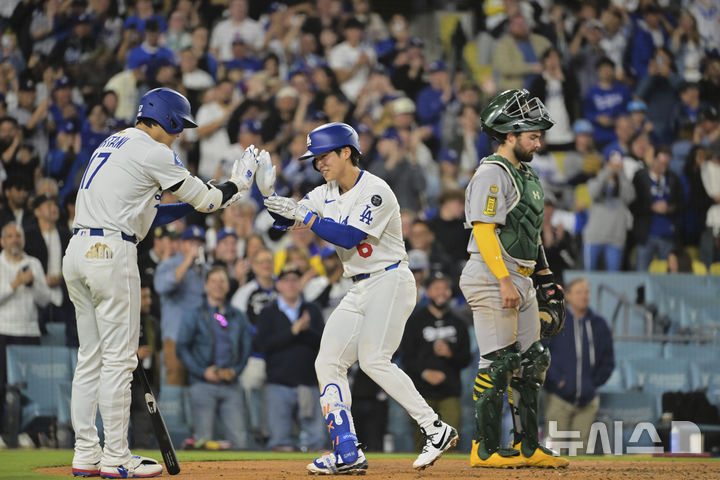 [로스앤젤레스=AP/뉴시스] LA 다저스의 김혜성(가운데)이 14일(현지 시간) 미 캘리포니아주 로스앤젤레스의 다저스타디움에서 열린 2025 메이저리그 오클랜드 애슬레틱스와의 경기 5회 말 동점을 기록하는 1점 홈런(시즌 1호)을 친 후 홈에 들어와 오타니 쇼헤이와 하이 파이브를 하고 있다. 2025.05.15.