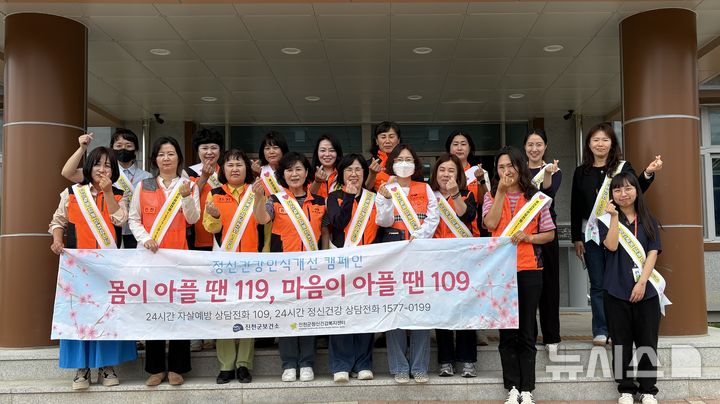 [청주=뉴시스] 15일 충북 진천군 덕산중학교에서 진천군 정신건강복지센터 직원들이 자살 예방 및 정신건강 인식개선 캠페인을 진행한 뒤 기념촬영을 하고 있다. (사진=진천군 제공) 2025.05.15. [email protected]