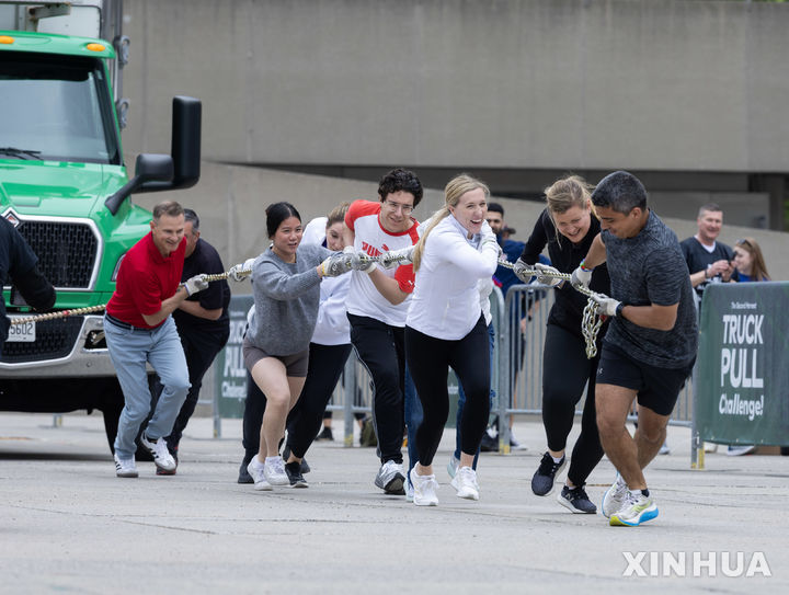 [토론토=신화/뉴시스] 14일(현지 시간) 캐나다 토론토에서 ‘세컨드 하비스트 트럭 끌기 대회’가 열려 참가자들이 트럭 끌기에 도전하고 있다. 이 행사는 음식 낭비를 줄이고 식량 불안을 해소하기 위한 기금 마련을 목적으로, 캐나다 최대 음식 재분배 단체인 ‘세컨드 하비스트’(Second Harvest)가 주최했다. 세컨드 하비스트는 유통 기한이 임박했거나 소비되지 않은 식품을 수거해 다시 배분함으로써 음식 낭비를 줄이는 데 앞장서고 있으며, 이날 행사에는 50개 이상의 팀이 참가한 것으로 알려졌다. 2025.05.15.