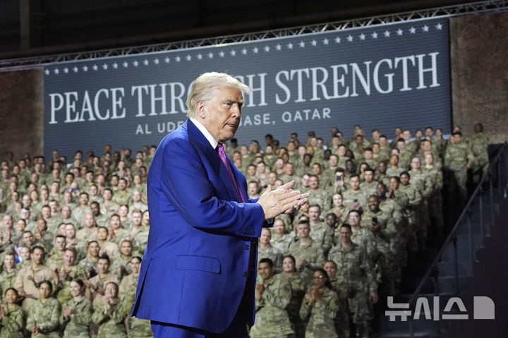 [도하=AP/뉴시스] 도널드 트럼프 미국 대통령이 15일(현지 시간) 카타르의 알우데이드 공군기지에서 연설한 뒤 무대를 떠나고 있다. 그는 이날 카타르를 떠나 마지막 순방국 아랍에미리트(UAE) 수도 아부다비로 향했다. 2025.05.15.