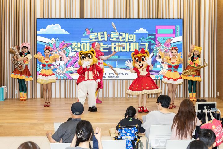 [서울=뉴시스] 롯데월드가 14일 경기 하남 보바스병원 보바스어린이재활센터에서 가정의 달을 맞아 찾아가는 테마파크 공연을 선보이고 있다. 이날 행사에는 롯데월드 대표 캐릭터 로티, 로리가 롯데월드 엔터테인먼트팀과 함께 롯데월드 테마송 공연, 저글링 퍼포먼스, 밴드공연 등을 진행했다. (사진=롯데월드 제공) 2025.05.15. [email protected] *재판매 및 DB 금지