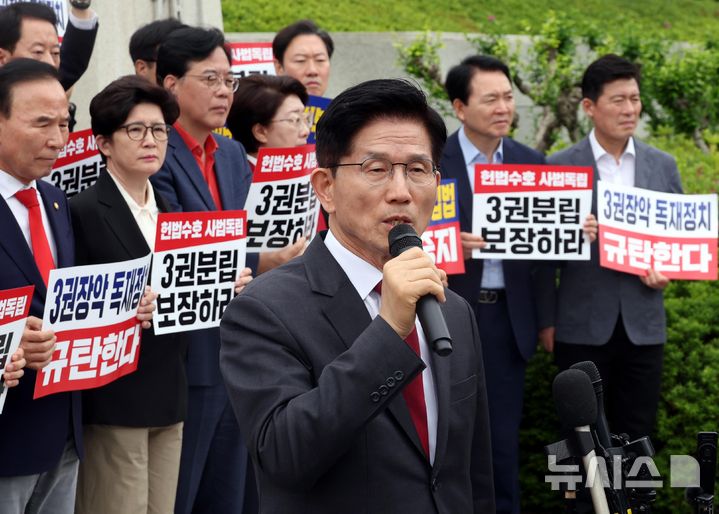 [서울=뉴시스] 조성봉 기자 = 김문수 국민의힘 대선후보가 15일 서울 서초구 대법원 앞에서 열린 사법부수호 및 민주당 규탄대회에서 발언을 하고 있다. 2025.05.15. [email protected]