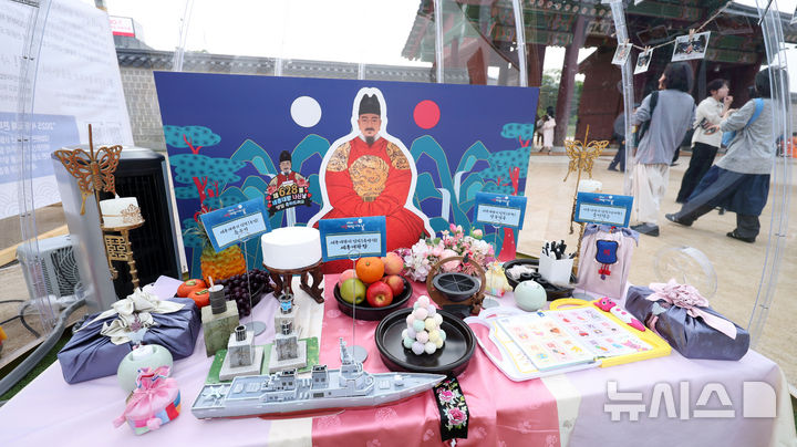 [서울=뉴시스] 김선웅 기자 = 스승의 날이자 '628돌 세종대왕 나신 날'인 15일 서울 종로구 경복궁 흥례문 광장 일대에서 열린 '인간 세종, 이도가 사랑했던 것들, 독서, 음악, 백성, 훈민정음' 및 '대왕 세종, 백성을 사랑해서 남긴 유산'을 주제로 열린 전시·체험행사에서 세종의 업적과 유산이 전시되고 있다. 2025.05.15. [email protected]