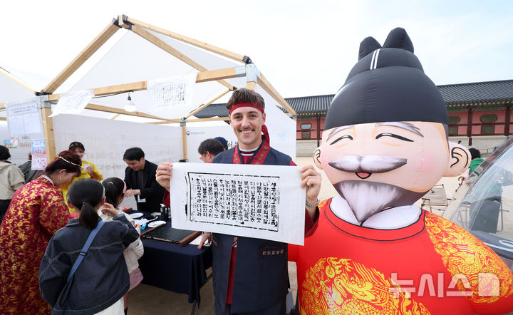 [서울=뉴시스] 김선웅 기자 = 스승의 날이자 '628돌 세종대왕 나신 날'인 15일 서울 종로구 경복궁 흥례문 광장 일대에서 열린 '인간 세종, 이도가 사랑했던 것들, 독서, 음악, 백성, 훈민정음' 및 '대왕 세종, 백성을 사랑해서 남긴 유산'을 주제로 열린 전시·체험행사에서 외국인 관광객이 훈민정음 서문 탁본을 들고 사진을 촬영하고 있다. 2025.05.15. [email protected]