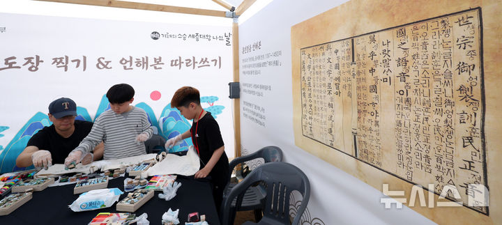 [서울=뉴시스] 김선웅 기자 = 스승의 날이자 '628돌 세종대왕 나신 날'인 15일 서울 종로구 경복궁 흥례문 광장 일대에서 열린 '인간 세종, 이도가 사랑했던 것들, 독서, 음악, 백성, 훈민정음' 및 '대왕 세종, 백성을 사랑해서 남긴 유산'을 주제로 열린 전시·체험행사에서 방문객들이 한글 도장찍기 체험을 하고 있다. 2025.05.15. [email protected]