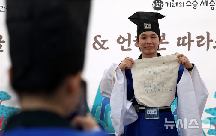 [서울=뉴시스] 김선웅 기자 = 스승의 날이자 '628돌 세종대왕 나신 날'인 15일 서울 종로구 경복궁 흥례문 광장 일대에서 열린 '인간 세종, 이도가 사랑했던 것들, 독서, 음악, 백성, 훈민정음' 및 '대왕 세종, 백성을 사랑해서 남긴 유산'을 주제로 열린 전시·체험행사에서 방문객이 한글도장찍기 체험으로 만든 가방을 든 진행요원이 기념사진을 촬영하고 있다. 2025.05.15. [email protected]