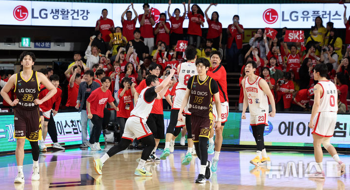 [창원=뉴시스] 추상철 기자 = 15일 오후 경남 창원체육관에서 열린 2024-2025 프로농구 챔피언결정전 서울 SK 나이츠와 창원 LG 세이커스 6차전 경기, 54대51 승리를 거둔 SK 선수들이 기뻐하고 있다. 2025.05.15. [email protected]