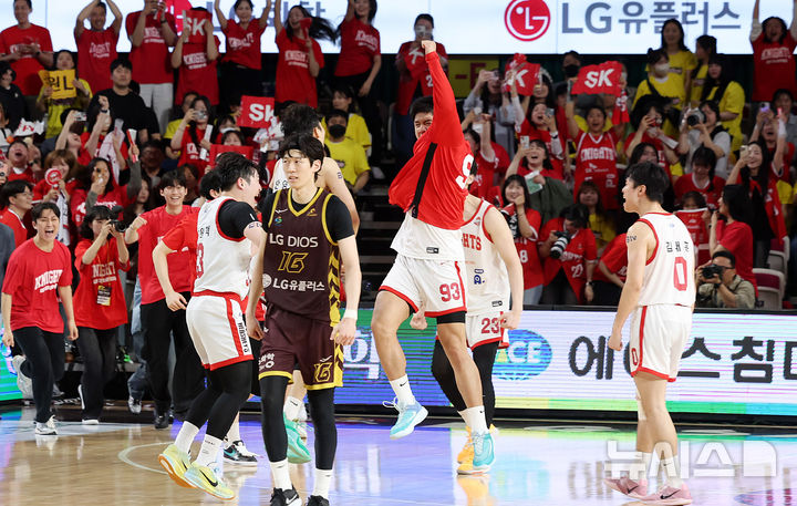 [창원=뉴시스] 추상철 기자 = 15일 오후 경남 창원체육관에서 열린 2024-2025 프로농구 챔피언결정전 서울 SK 나이츠와 창원 LG 세이커스 6차전 경기, 54대51 승리를 거둔 SK 선수들이 기뻐하고 있다. 2025.05.15. [email protected]