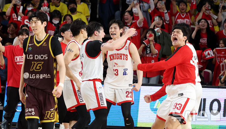 [창원=뉴시스] 추상철 기자 = 15일 오후 경남 창원체육관에서 열린 2024-2025 프로농구 챔피언결정전 서울 SK 나이츠와 창원 LG 세이커스 6차전 경기, 54대51 승리를 거둔 SK 선수들이 기뻐하고 있다. 2025.05.15. [email protected]