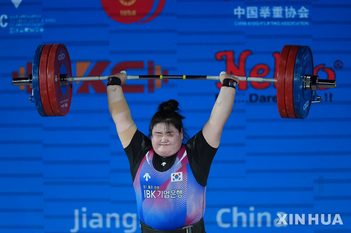[장산=신화/뉴시스] 박혜정이 15일(현지 시간) 중국 저장성 장산에서 열린 2025 아시아역도선수권대회 여자 87㎏ 이상급 경기를 펼치고 있다. 박혜정은 인상 125㎏, 용상 160㎏, 합계 285㎏을 들어 올려 합계 2위(인상 2위, 용상 3위)를 기록했다. 아시아역도선수권은 인상, 용상, 합계 세 부문에서 각각 메달이 수여돼 박혜정은 은메달 2개, 동메달 1개를 수확했다. 2025.05.16.