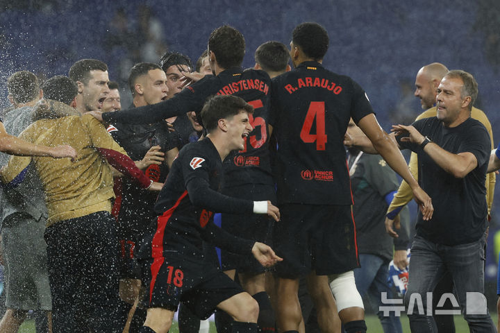 [바르셀로나=AP/뉴시스] FC 바르셀로나 선수들이 15일(현지 시간) 스페인 바르셀로나의 RCDE 경기장에서 열린 2024-25 라리가 36라운드 에스파뇰과의 원정 경기를 승리로 마쳐 리그 우승을 확정한 후 환호하고 있다. 바르셀로나가 2-0으로 승리하면서 남은 2경기 결과에 상관없이 리그 우승을 확정했다. 통산 28번째 우승. 2025.05.16.