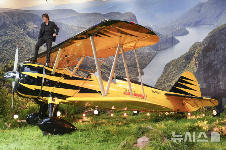 [런던=AP/뉴시스] 배우 톰 크루즈가 15일(현지 시간) 영국 런던에서 열린 영화 '미션 임파서블: 파이널 레코닝' 시사회에 참석해 비행기 세트 위에 올라가 포즈를 취하고 있다. 2025.05.16.