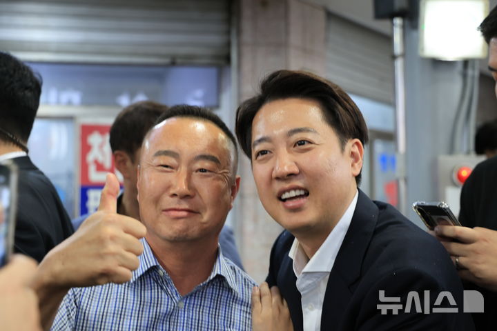 [천안=뉴시스] 박우경 기자=16일 이준석 개혁신당 대통령 후보가 충남권 표심 확보를 위해 충남 천안중앙시장을 찾아 시민과 기념촬영을 하고 있다. 2025.5.16. [email protected]