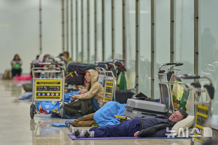 [마드리드=AP/뉴시스] 15일(현지 시간) 스페인 마드리드의 아돌포 수아레스 마드리드-바라하스 공항 4터미널 바닥에서 사람들이 잠을 자고 있다. 공항 당국은 터미널 내에 증가하는 노숙자 문제로 일부 시간대에 탑승권이 없는 사람들의 출입을 제한할 것으로 전해졌다. 2025.05.16.