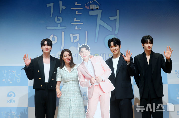 [서울=뉴시스] 김혜진 기자 = 배우 안재현(왼쪽부터), 이민정, 김정현, 김재원이 16일 오전 서울 영등포구 KBS에서 열린 KBS2 새 예능 프로그램 '가는정 오는정 이민정' 제작발표회에서 포즈를 취하고 있다. 2025.05.16. [email protected]
