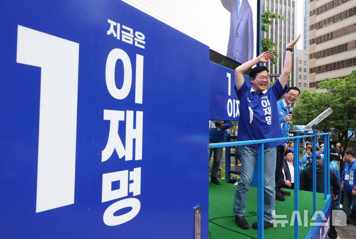 [서울=뉴시스] 고승민 기자 = 박찬대 더불어민주당 대표 직무대행 겸 원내대표(중앙선대위 총괄선대위원장)이 16일 서울 여의도 우체국 앞에서 이재명 대선 후보 선거 유세를 하고 있다. 2025.05.16. [email protected]