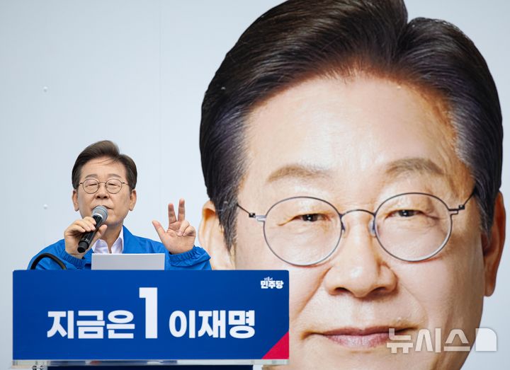 [익산=뉴시스] 조성우 기자 = 이재명 더불어민주당 대선후보가 16일 전북 익산시 익산역 동부광장에서 열린 유세에서 지지를 호소하고 있다. (공동취재) 2025.05.16. [email protected]
