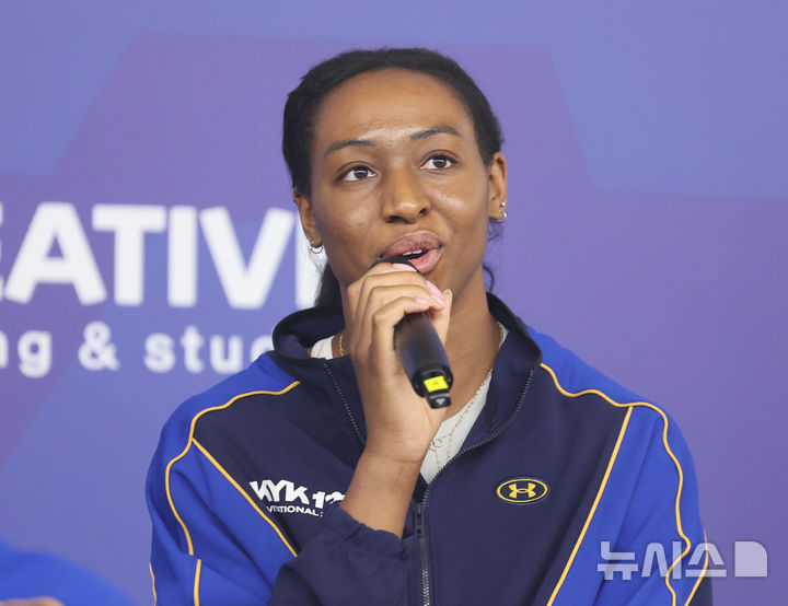 [인천=뉴시스] 전진환 기자 = 16일 오후 인천 부평구 인천삼산월드체육관에서 열린 ‘KYK 인비테이셔널 2025’ 미디어데이에서 여자배구 세계올스타팀 치아카 오그보구(미국)이 발언하고 있다. 2025.05.16. [email protected]