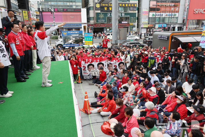 [천안=뉴시스] 조성봉 기자 = 김문수 국민의힘 대선후보가 16일 충남 천안시 신세계 백화점 앞에서 열린 유세에서 시민들에게 지지를 호소하고 있다.(공동취재) 2025.05.16. [email protected]